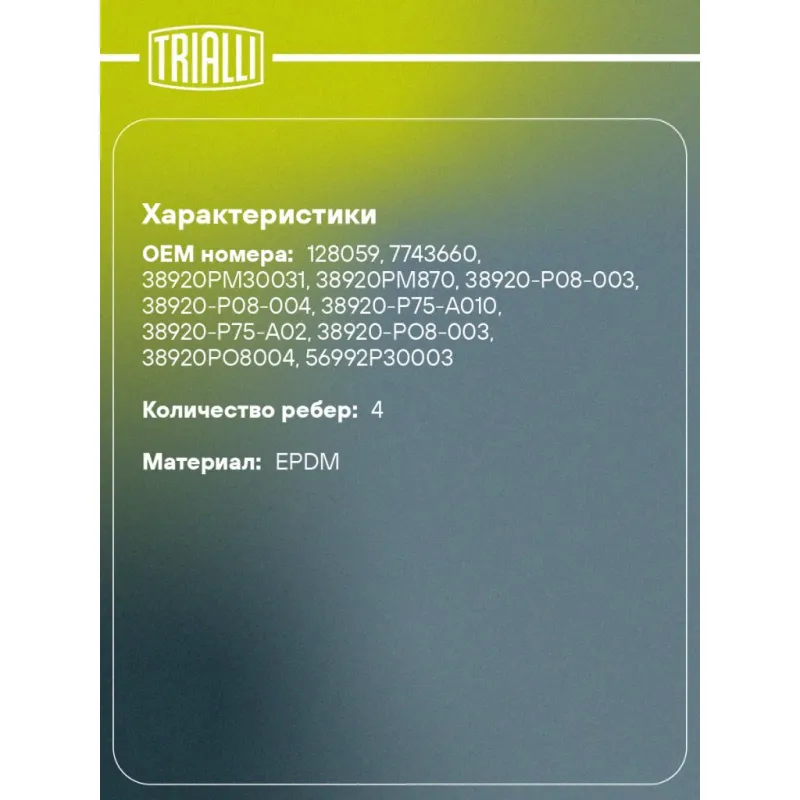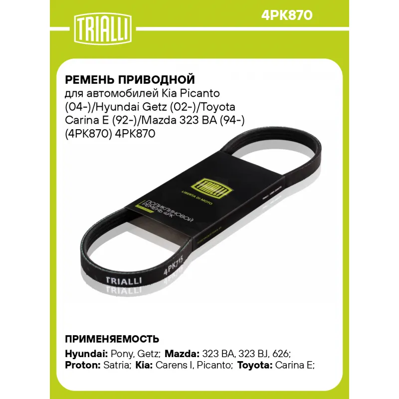 Ремень приводной для автомобилей Kia Picanto (04-)/Hyundai Getz (02-)/Toyota Carina E (92-)/Mazda 323 BA (94-) (4PK870) Характеристики: Артикул: 4PK870 OEM номера: 128059, 7743660, 38920PM30031, 38920PM870, 38920-P08-003, 38920-P08-004, 38920-P75-A010, 38920-P75-A02, 38920-PO8-003, 38920PO8004, 56992P30003, 56992-P30-004, 38920PM3003, 38920-PM3-0030, 38920PM3014, 38920PM30140, 38920-PM5-A11, 38920PM5A12, 1A23-18-381, B61P15907, D53015907, MD106658, 1340A056, 1340A067, MD069671, 11720V7300, 11720V7301, 11720V7310, 11720-V7311, A1720-V7302, 128025, 90916-02433, 99364208708P, 9091602424, 90916-02423, 9936400870, 9936420870, 9936520870, 9936550870, 9936580870, V1090910, V1091150, 2521221200, 25212-21220, 2521224320, 2521224350, 0K55215909, 24100557, PW502943, PW510580, GFB375, GMB108, PQS101340 Количество на автомобиль: 1 Длина, мм.: 870 Количество ребер: 4 Материал: EPDM Товарная линейка: BLACK Номера аналоги: 4PK868, 4PK869, 4PK870, 4PK871, 4PK872 Подходит для авто: Hyundai Pony (82-), Pony (82-), Getz (02-) Mazda 323 BA (94-), 323 BJ (98-), 626 (87-) Proton Satria (00-) Kia Carens I (99-), Picanto (04-) Toyota Carina E (92-) Для проверки применяемости отправьте VIN автомобиля через вкладку "Есть вопросы о товаре?" Комплектация: Ремень поликлиновой - 1 шт Гарантия: от 1 года.