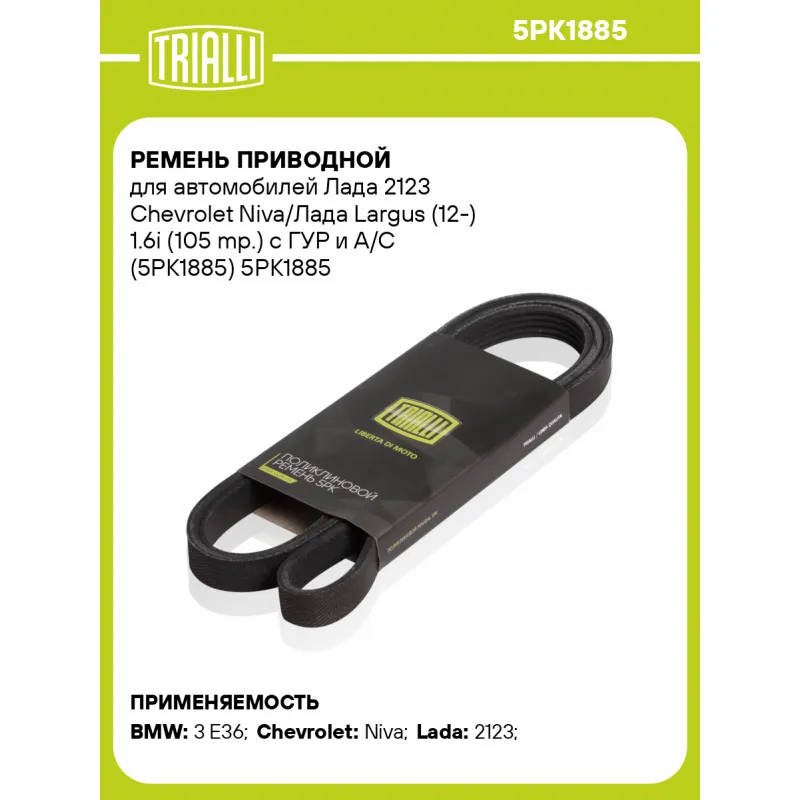 Ремень приводной для автомобилей Лада 2123 Chevrolet Niva/Лада Largus (12-) 1.6i (105 mp.) с ГУР и A/C (5PK1885) Характеристики: Артикул: 5PK1885 OEM номера: 11282245849, 2123104102031, 2123-1041020-33, 2123-1041020-30Р, 21230-1041020-31-0, 2123-1041020-30, 2123104102032, 2123-1041020-10, 11282245948, 21230104102082, 5PK1888, 2123100000000, 21230-1041020-32-0 Количество на автомобиль: 1 Длина, мм.: 1885 Количество ребер: 5 Материал: EPDM Товарная линейка: BLACK Номера аналоги: 5PK1883, 5PK1884, 5PK1885, 5PK1886, 5PK1887, 5PK 1888 Подходит для авто: BMW 3 E36 (90-) Chevrolet Niva (02-) ВАЗ 2123 Для проверки применяемости отправьте VIN автомобиля через вкладку "Есть вопросы о товаре?" Комплектация: Ремень поликлиновой - 1 шт Гарантия: от 1 года.