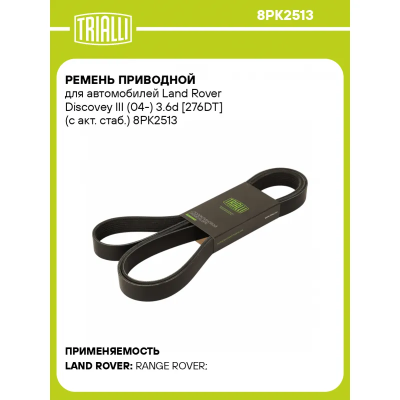 Ремень приводной для автомобилей Land Rover Discovey III (04-) 3.6d [276DT] (с акт. стаб.) Характеристики: Артикул: 8PK2513 OEM номера: PQS500430, PQS500420, PQS500340 Материал: EPDM Количество ребер: 8 Длина, мм.: 2513 Товарная линейка: BLACK Количество на автомобиль: 1 Комплектация: Ремень поликлиновой - 1 шт Гарантия: от 1 года.