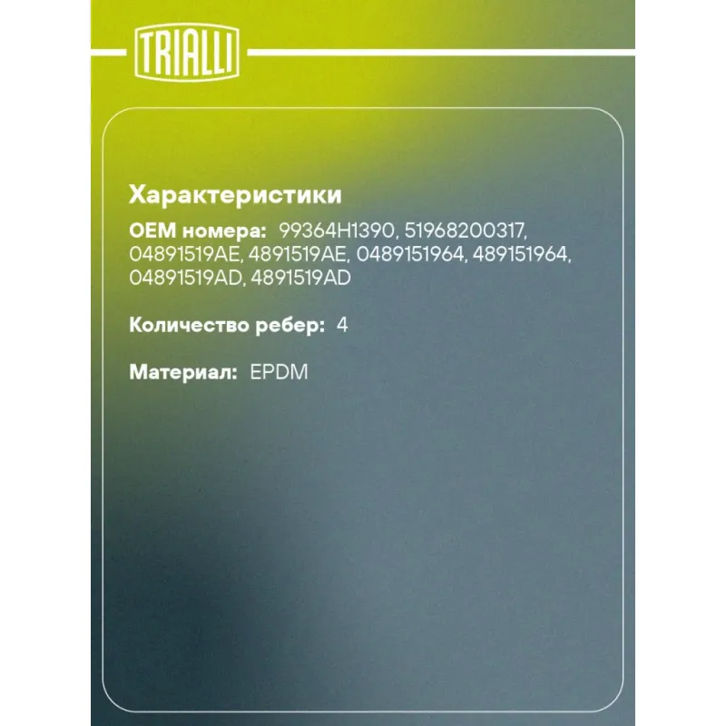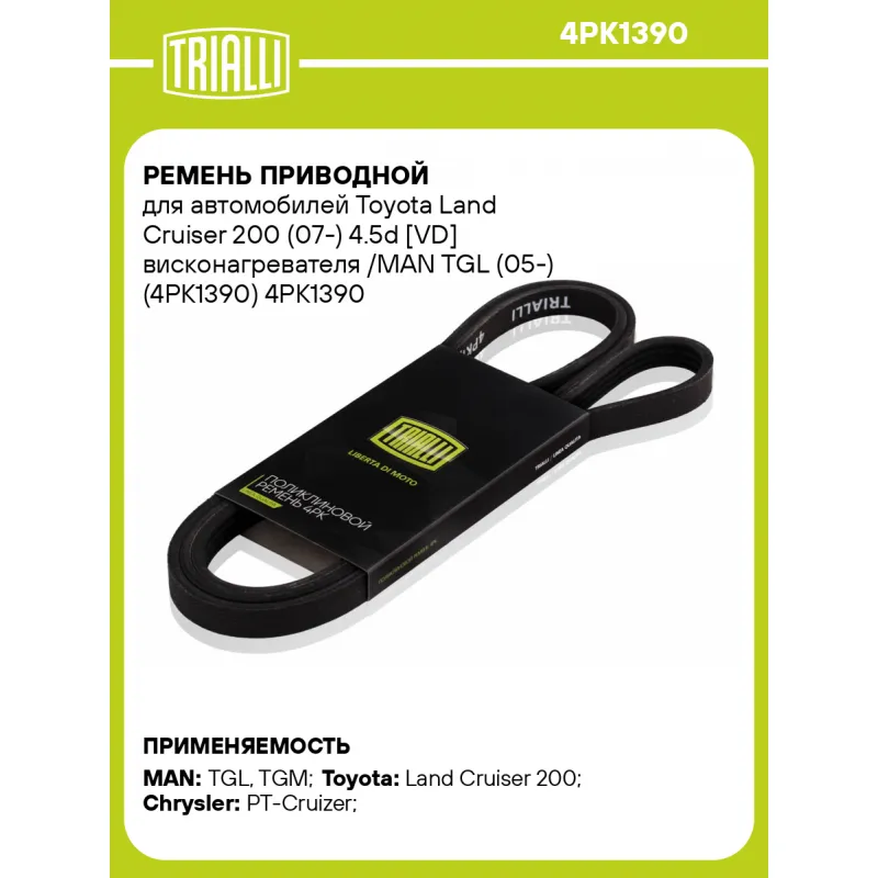 Ремень приводной для автомобилей Toyota Land Cruiser 200 (07-) 4.5d [VD] висконагревателя /MAN TGL (05-) (4PK1390) Характеристики: Артикул: 4PK1390 OEM номера: 99364H1390, 51968200317, 04891519AE, 4891519AE, 0489151964, 489151964, 04891519AD, 4891519AD Количество на автомобиль: 1 Длина, мм.: 1390 Количество ребер: 4 Материал: EPDM Товарная линейка: BLACK Номера аналоги: 4PK1387, 4PK1388, 4PK1389, 4PK1390, 4PK1391, 4PK1392 Подходит для авто: MAN TGL (05-), TGM (05-) Toyota Land Cruiser 200 (07-) Chrysler PT-Cruizer (00-) Для проверки применяемости отправьте VIN автомобиля через вкладку "Есть вопросы о товаре?" Комплектация: Ремень поликлиновой - 1 шт Гарантия: от 1 года.