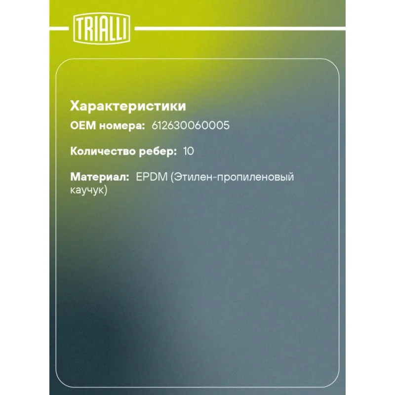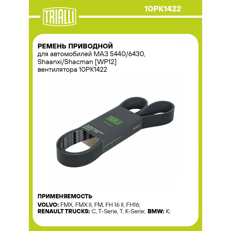Ремень приводной для автомобилей МАЗ 5440/6430, Shaanxi/Shacman [WP12] вентилятора Характеристики: Артикул: 10PK1422 OEM номера: 612630060005 Материал: EPDM (Этилен-пропиленовый каучук) Количество ребер: 10 Длина, мм.: 1422 Товарная линейка: BLACK Количество на автомобиль: 1 Комплектация: Ремень поликлиновой - 1 шт Гарантия: от 1 года.
