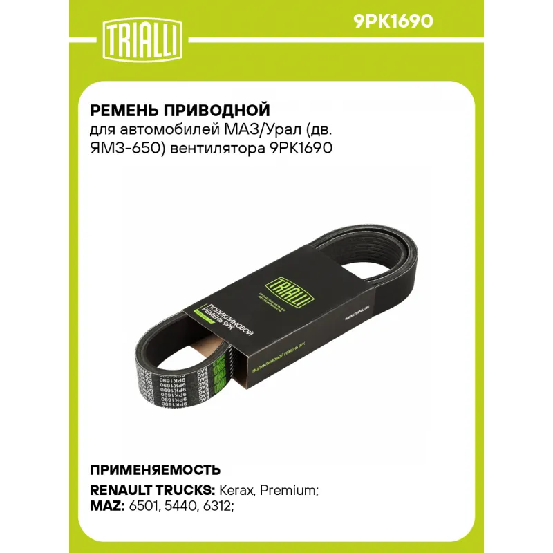 Ремень приводной для автомобилей МАЗ/Урал (дв. ЯМЗ-650) вентилятора Характеристики: Артикул: 9PK1690 OEM номера: 650.1308020, 5010477838 Материал: EPDM Количество ребер: 9 Длина, мм.: 1690 Товарная линейка: BLACK Количество на автомобиль: 1 Комплектация: Ремень поликлиновой - 1 шт Гарантия: от 1 года.