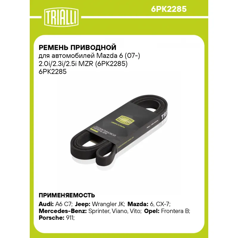 Ремень приводной для автомобилей Mazda 6 (07-) 2.0i/2.3i/2.5i MZR (6PK2285) Характеристики: Артикул: 6PK2285 OEM номера: 3032857AB, 53032857AB, 1854733, 97130560, 8-97130-560-0, L33615909, L33615909A, L33615909B, L37G-15-909, L3B615909, L510-15-909A, L51015909B, L510-15-909C, L538-15-909A, 0089978892, A0089978892, 0129971192, A0129971192, 0129971092, A0129971092, 19931796, 89978892, 129971092, 129971192, A0019931796, 0019931796, 99919237950, 06E903137AA, 078903137C, 10185656, 53012002, 53054449, 102301139L Количество на автомобиль: 1 Длина, мм.: 2285 Количество ребер: 6 Материал: EPDM Товарная линейка: BLACK Подходит для авто: Audi A6 C7 (11-) Jeep Wrangler JK (07-) Mazda 6 (07-), CX-7 (07-) Mercedes-Benz Sprinter (06-), Viano (W639) (03-), Vito (W639) (03-) Opel Frontera B (98-) Porsche 911 (996) (97-), 911 (997) (04-) Для проверки применяемости отправьте VIN автомобиля через вкладку "Есть вопросы о товаре?" Комплектация: Ремень поликлиновой - 1 шт Гарантия: от 1 года.