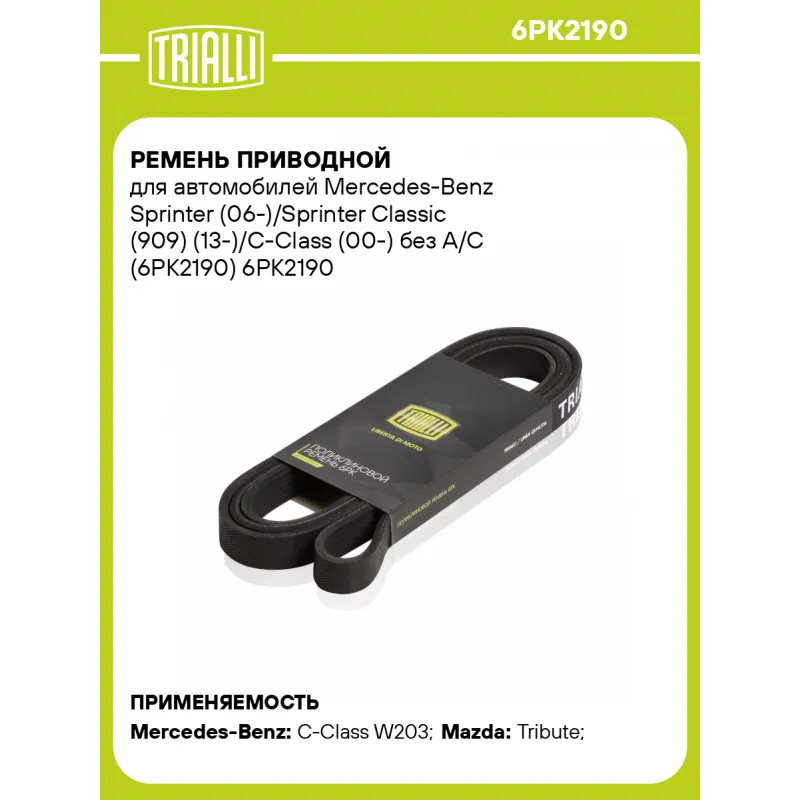 Ремень приводной для автомобилей Mercedes-Benz Sprinter (06-)/Sprinter Classic (909) (13-)/C-Class (00-) без A/C (6PK2190) Характеристики: Артикул: 6PK2190 OEM номера: A0029936896, 4071946, XL2Z8620BA, 1303929, 2S6G6C301BA, 2S6G6C301CA, 3S5Q6C301BA, XL2E8620BA, CW93-6C301-BA, C2D19766, 109979192, 129970592, 129974792, 139971192, 139972292, 149970992, 012 997 05 92, 012 997 47 92, 013 997 22 92, A 010 997 91 92, A 012 997 47 92, A 013 997 22 92, A 014 997 09 92, A 013 997 11 92, A 012 997 05 92, 010 997 91 92, 013 997 11 92, 014 997 09 92, 12588408, 4892791AA, 53008722, 53010288, 53013905AA Количество на автомобиль: 1 Длина, мм.: 2190 Количество ребер: 6 Материал: EPDM Товарная линейка: BLACK Подходит для авто: Mercedes-Benz C-Class W203 (00-) Mazda Tribute (04-) Для проверки применяемости отправьте VIN автомобиля через вкладку "Есть вопросы о товаре?" Комплектация: Ремень поликлиновой - 1 шт Гарантия: от 1 года.