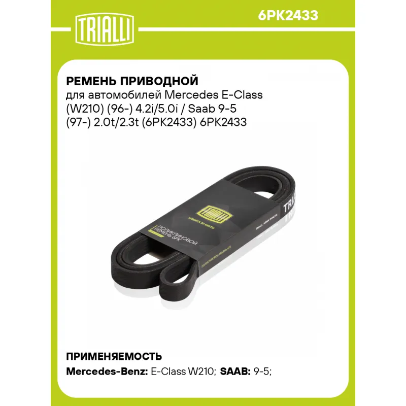 Ремень приводной для автомобилей Mercedes E-Class (W210) (96-) 4.2i/5.0i / Saab 9-5 (97-) 2.0t/2.3t (6PK2433) Характеристики: Артикул: 6PK2433 OEM номера: 0009933896, 0119974692, A0009933896, A0119974692, 119974692, 9933896, EH228620AA, LR051263, 5590344, 55563222, 48 96 320, 31316096, 077903137G, 059903137BA Количество на автомобиль: 1 Длина, мм.: 2433 Количество ребер: 6 Материал: EPDM Товарная линейка: BLACK Подходит для авто: Mercedes-Benz E-Class W210 (95-) SAAB 9-5 (97-) Для проверки применяемости отправьте VIN автомобиля через вкладку "Есть вопросы о товаре?" Комплектация: Ремень поликлиновой - 1 шт Гарантия: от 1 года.