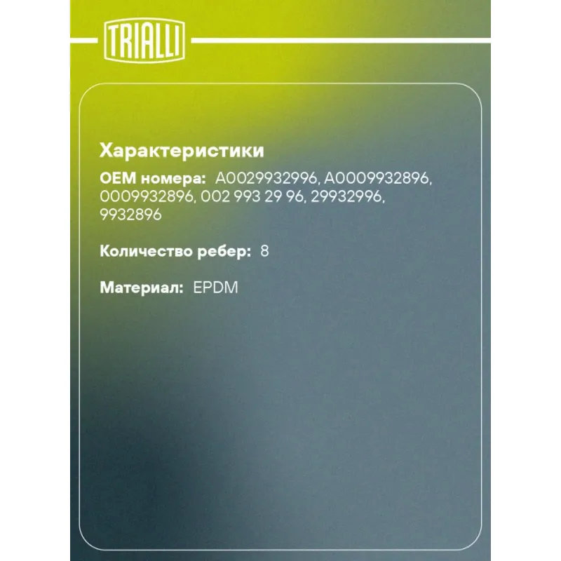 Ремень приводной для автомобилей Mercedes GL (X164) (06-) 3.0d (до 08.2008) Характеристики: Артикул: 8PK2035 OEM номера: A0029932996, A0009932896, 0009932896, 002 993 29 96, 29932996, 9932896 Материал: EPDM Количество ребер: 8 Длина, мм.: 2035 Товарная линейка: BLACK Количество на автомобиль: 1 Комплектация: Ремень поликлиновой - 1 шт Гарантия: от 1 года.