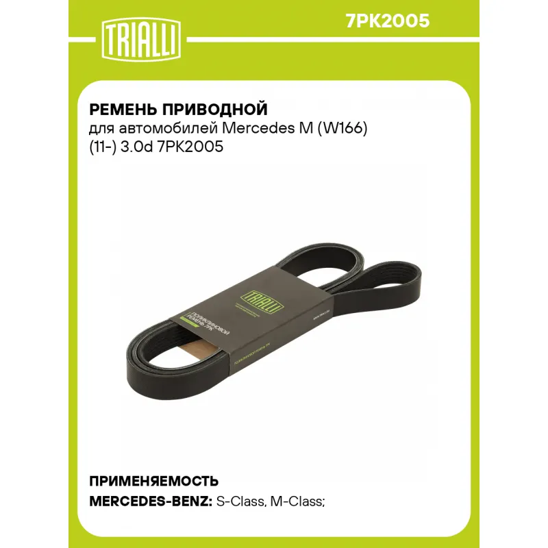 Ремень приводной для автомобилей Mercedes M (W166) (11-) 3.0d Характеристики: Артикул: 7PK2005 OEM номера: 0029935096, A0029935096, 29935096 Материал: EPDM Количество ребер: 7 Длина, мм.: 2035 Гарантийный срок: 2 года/60 000 км. Товарная линейка: BLACK Количество на автомобиль: 1 Комплектация: Ремень поликлиновой - 1 шт Гарантия: от 1 года.