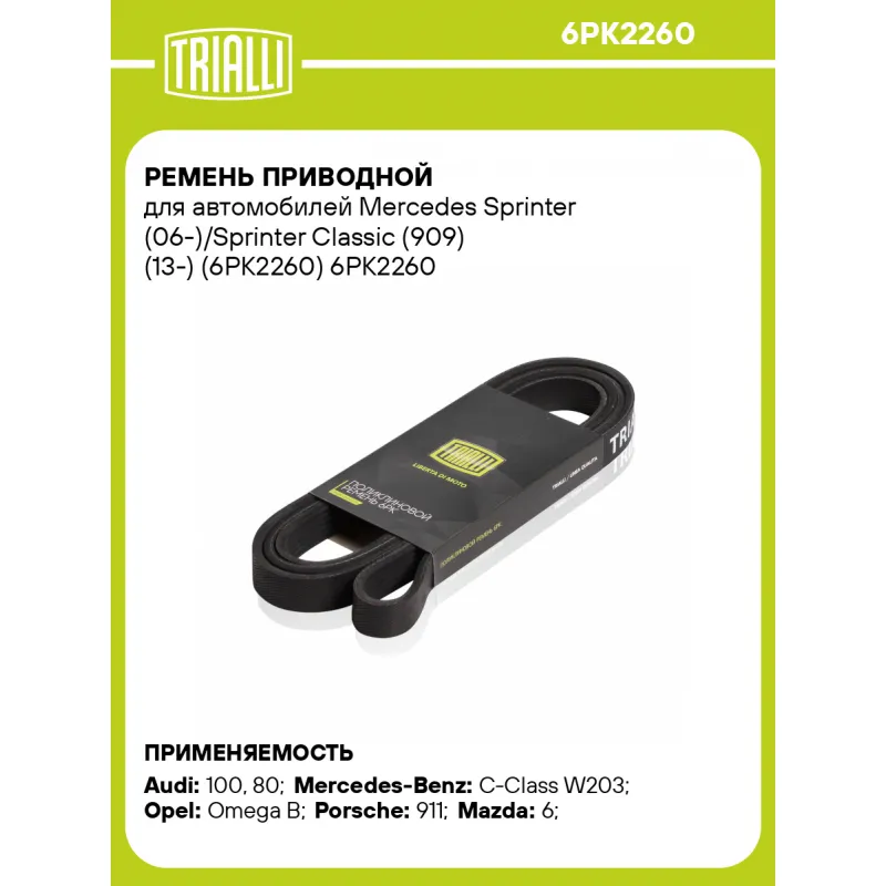 Ремень приводной для автомобилей Mercedes Sprinter (06-)/Sprinter Classic (909) (13-) (6PK2260) Характеристики: Артикул: 6PK2260 OEM номера: 68027636AA, 5103565AA, LF1915909A, LF1915909B, LFA115909, LFA1159099F, LFH115909B, 0129974892, 0139972392, 0149970692, 6119972292, 6119973092, 0019938696, A6119972292, 0149970792, 149970792, 149971792, A6119973092, 0149971792, 0089971892, 19938696, A0149970792, A0149971792, 149970692, 89971892, 129974892, 139972392, A0129974892, A0139972392, A0149970692, XA0149972392, A0019938696, A0089971892, 1340615, 1854714, 90448002, 90500354, 1854723, 90501385, 99610215193, 9091602462, 078903137K, 078903137P, 68045801AA, 5DA015909 Количество на автомобиль: 1 Длина, мм.: 2260 Количество ребер: 6 Материал: EPDM Товарная линейка: BLACK Подходит для авто: Audi 100 (90-), 80 (91-) Mercedes-Benz C-Class W203 (00-), E-Class W211 (02-), S-Class W220 (98-), Sprinter (06-), Viano (W639) (03-), Vito (W639) (03-) Opel Omega B (94-) Porsche 911 (997) (04-) Mazda 6 (02-) Для проверки применяемости отправьте VIN автомобиля через вкладку "Есть вопросы о товаре?" Комплектация: Ремень поликлиновой - 1 шт Гарантия: от 1 года.