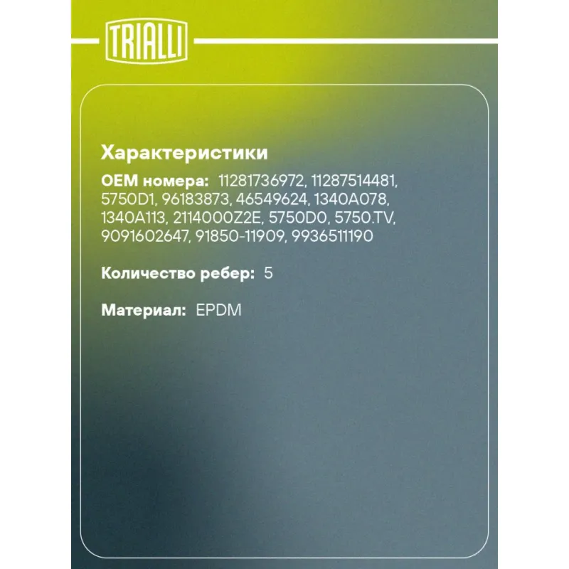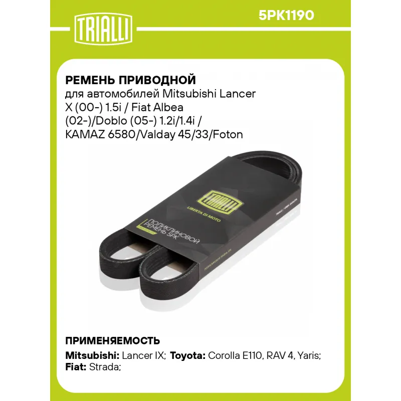 Ремень приводной для автомобилей Mitsubishi Lancer X (00-) 1.5i / Fiat Albea (02-)/Doblo (05-) 1.2i/1.4i / KAMAZ 6580/Valday 45/33/Foton Auman [ISG12] генератора Характеристики: Артикул: 5PK1190 OEM номера: 11281736972, 11287514481, 5750D1, 96183873, 46549624, 1340A078, 1340A113, 2114000Z2E, 5750D0, 5750.TV, 9091602647, 91850-11909, 9936511190, 9936521190, 9936571190, 9936581190, 9936591190, 99365A1190, 99365-C1190, 99365-D1190, GMB51190, PQS101130, 3694080F Количество на автомобиль: 1 Длина, мм.: 1190 Количество ребер: 5 Материал: EPDM Товарная линейка: BLACK Номера аналоги: 5PK1188, 5PK1189, 5PK1190, 5PK1191, 5PK1192 Подходит для авто: Mitsubishi Lancer IX (00-), Lancer IX (00-) Toyota Corolla E110 (95-), RAV 4 (00-), Yaris (99-) Fiat Strada (99-) Для проверки применяемости отправьте VIN автомобиля через вкладку "Есть вопросы о товаре?" Комплектация: Ремень поликлиновой - 1 шт Гарантия: от 1 года.