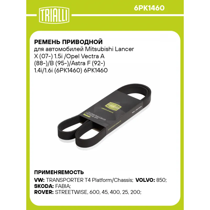 Ремень приводной для автомобилей Mitsubishi Lancer X (07-) 1.5i /Opel Vectra A (88-)/B (95-)/Astra F (92-) 1.4i/1.6i (6PK1460) Характеристики: Артикул: 6PK1460 OEM номера: 11287832327, 11287830945, 11287837898, 7837898, 9004A-91050, 1308228, 2T1Q6C301AA, 1E031508A, 1E0315908A, 9069970592, A9069970592, 1340617, 1340645, 1340728, 90285679, 90467130, 90501384, 9129100, 9129463, 9226257, 7700735905, PQS100851, 044903137H, 93181712 Количество на автомобиль: 1 Длина, мм.: 1460 Количество ребер: 6 Материал: EPDM Товарная линейка: BLACK Комплектация: Ремень поликлиновой - 1 шт Гарантия: от 1 года.