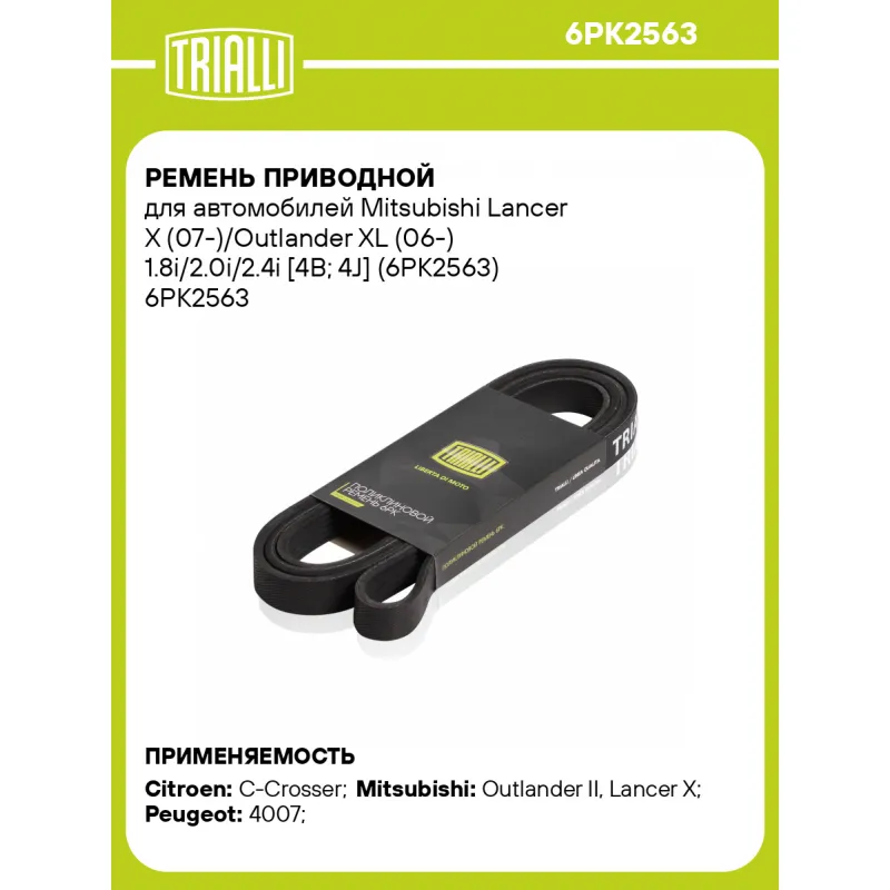 Ремень приводной для автомобилей Mitsubishi Lancer X (07-)/Outlander XL (06-) 1.8i/2.0i/2.4i [4B; 4J] (6PK2563) Характеристики: Артикул: 6PK2563 OEM номера: 16070171, 1607017180, 5750YT, 1340A117, 4451A074, 4451A114, 1340A123, PQR500340, PQS500251 Количество на автомобиль: 1 Длина, мм.: 2563 Количество ребер: 6 Материал: EPDM Товарная линейка: BLACK Подходит для авто: Citroen C-Crosser (07-), C-Crosser (07-) Mitsubishi Outlander II (06-), Lancer X (07-) Peugeot 4007 (07-) Для проверки применяемости отправьте VIN автомобиля через вкладку "Есть вопросы о товаре?" Комплектация: Ремень поликлиновой - 1 шт Гарантия: от 1 года.