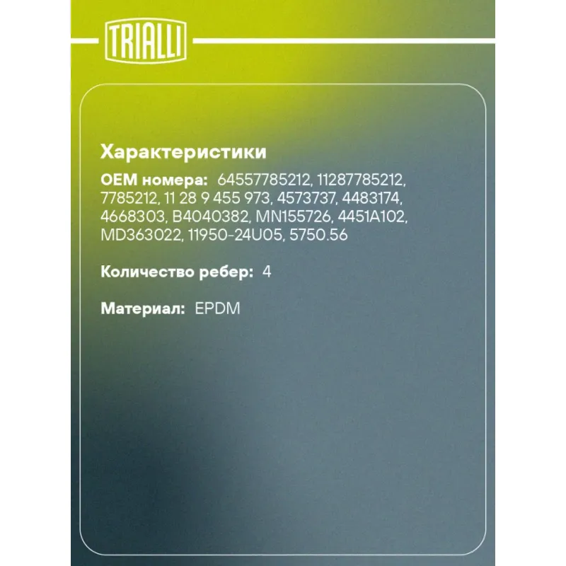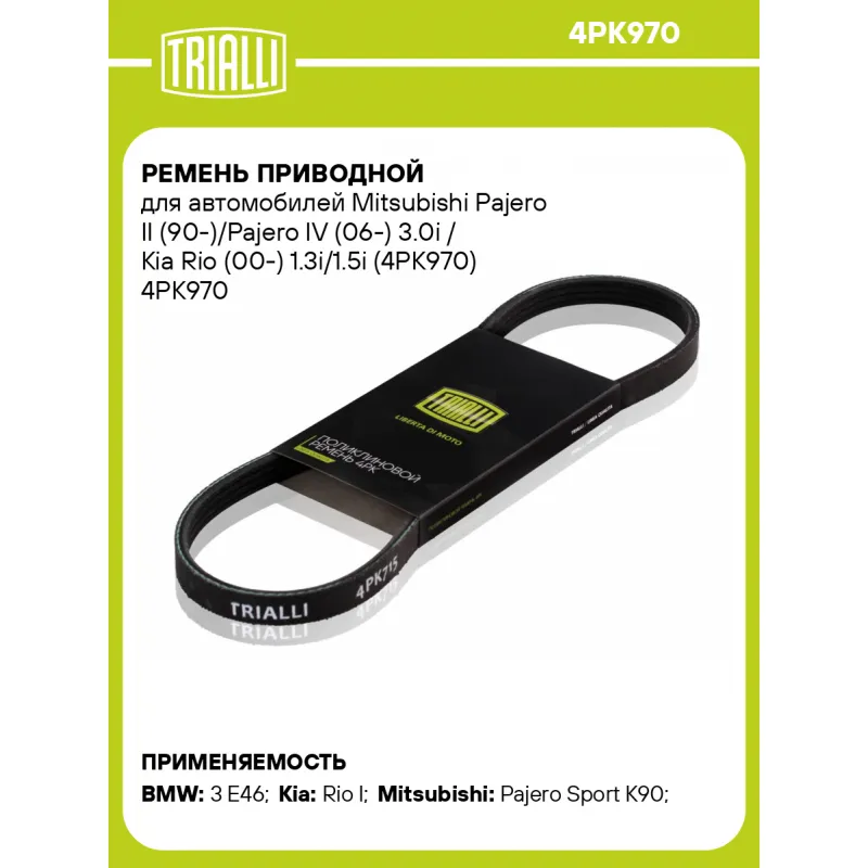 Ремень приводной для автомобилей Mitsubishi Pajero II (90-)/Pajero IV (06-) 3.0i / Kia Rio (00-) 1.3i/1.5i (4PK970) Характеристики: Артикул: 4PK970 OEM номера: 64557785212, 11287785212, 7785212, 11 28 9 455 973, 4573737, 4483174, 4668303, B4040382, MN155726, 4451A102, MD363022, 11950-24U05, 5750.56, 99364-00970, 99364-20970, 99364-70970, 0K30A15909A, 0K30C15909C Количество на автомобиль: 1 Длина, мм.: 970 Количество ребер: 4 Материал: EPDM Товарная линейка: BLACK Подходит для авто: BMW 3 E46 (98-) Kia Rio I (00-) Mitsubishi Pajero Sport K90 (98-) Для проверки применяемости отправьте VIN автомобиля через вкладку "Есть вопросы о товаре?" Комплектация: Ремень поликлиновой - 1 шт Гарантия: от 1 года.
