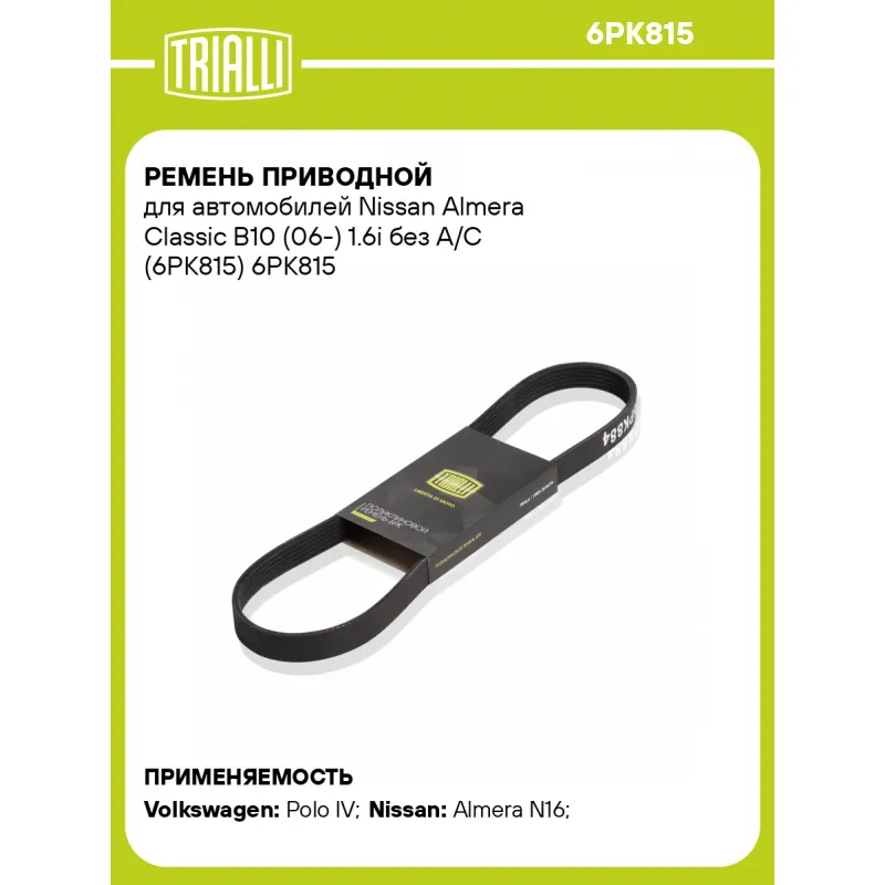 Ремень приводной для автомобилей Nissan Almera Classic B10 (06-) 1.6i без A/C (6PK815) Характеристики: Артикул: 6PK815 OEM номера: 71746480, 55193679, 55180009, 46755987 Количество на автомобиль: 1 Длина, мм.: 815 Количество ребер: 6 Материал: EPDM Товарная линейка: BLACK Подходит для авто: Volkswagen Polo IV (01-) Nissan Almera N16 (00-) Для проверки применяемости отправьте VIN автомобиля через вкладку "Есть вопросы о товаре?" Комплектация: Ремень поликлиновой - 1 шт Гарантия: от 1 года.