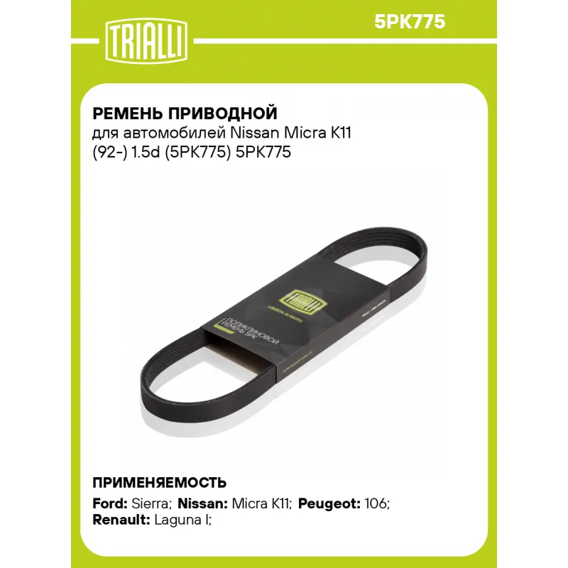 Ремень приводной для автомобилей Nissan Micra K11 (92-) 1.5d (5PK775) Характеристики: Артикул: 5PK775 OEM номера: 55230400, 5750K3, 5750P9, 5750WA, 5750.Q0, 5750.W9, 5750.XY, 96165811, 96273681, 11720-6F905, 5750W8, 5750.K2, 7700861465, 9936500780 Количество на автомобиль: 1 Длина, мм.: 775 Количество ребер: 5 Материал: EPDM Товарная линейка: BLACK Номера аналоги: 5PK773, 5PK774, 5PK775, 5PK776, 5PK777 Подходит для авто: Ford Sierra (82-) Nissan Micra K11 (92-) Peugeot 106 (96-) Renault Laguna I (94-) Для проверки применяемости отправьте VIN автомобиля через вкладку "Есть вопросы о товаре?" Комплектация: Ремень поликлиновой - 1 шт Гарантия: от 1 года.
