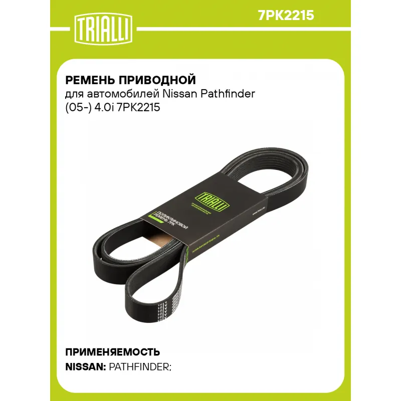 Ремень приводной для автомобилей Nissan Pathfinder (05-) 4.0i Характеристики: Артикул: 7PK2215 OEM номера: 11720-EA200 Материал: EPDM Количество ребер: 7 Длина, мм.: 2215 Гарантийный срок: 2 года/60 000 км. Товарная линейка: BLACK Количество на автомобиль: 1 Комплектация: Ремень поликлиновой - 1 шт Гарантия: от 1 года.