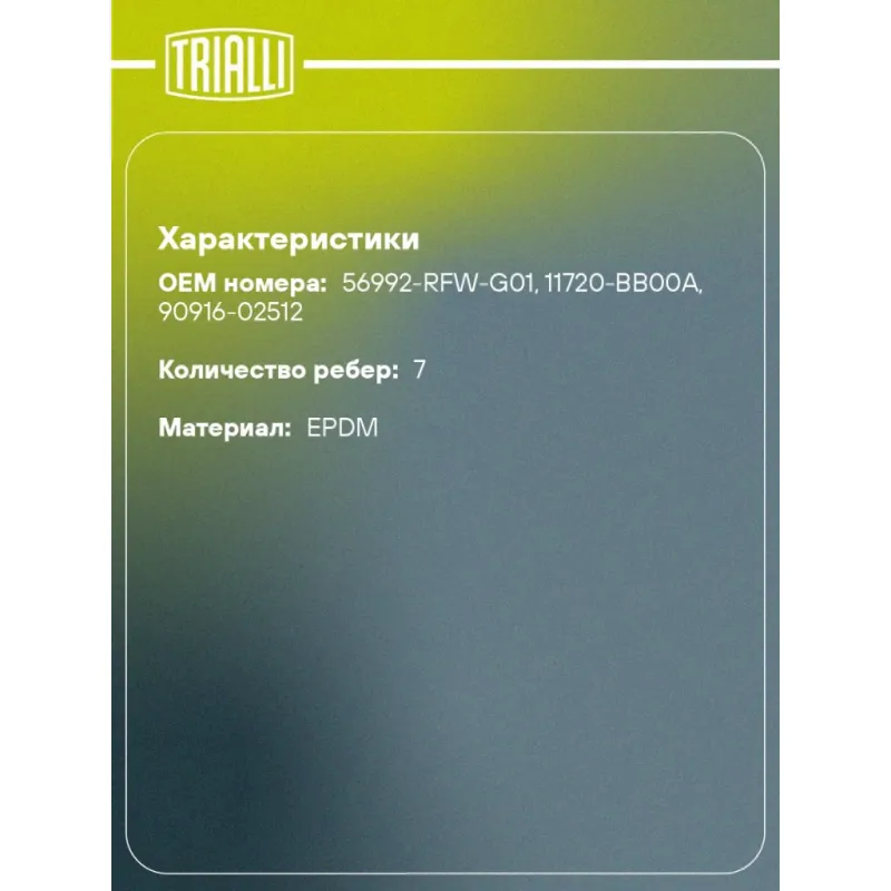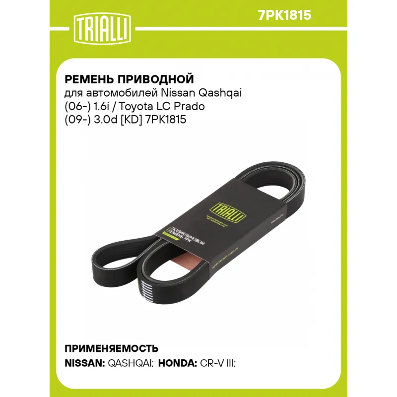 Ремень приводной для автомобилей Nissan Qashqai (06-) 1.6i / Toyota LC Prado (09-) 3.0d [KD] Характеристики: Артикул: 7PK1815 OEM номера: 56992-RFW-G01, 11720-BB00A, 90916-02512 Материал: EPDM Количество ребер: 7 Длина, мм.: 1815 Гарантийный срок: 2 года/60 000 км. Количество на автомобиль: 1 Товарная линейка: BLACK Комплектац... Читать полностью →
