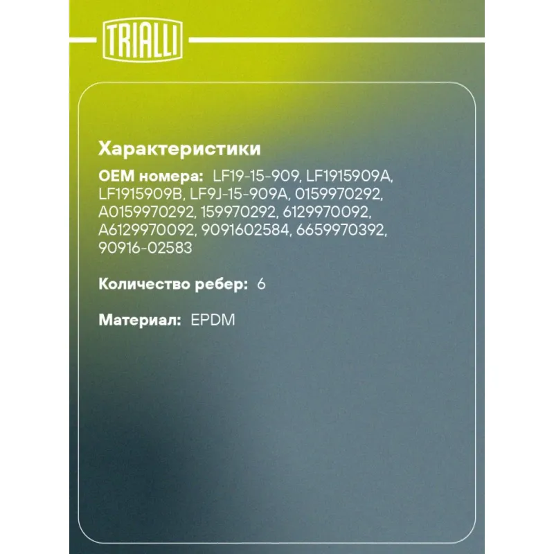 Ремень приводной для автомобилей Nissan X-Trail T30 (00-) 2.0i/2.5i /Mazda 6 (02-) 1.8i (6PK2250) Характеристики: Артикул: 6PK2250 OEM номера: LF19-15-909, LF1915909A, LF1915909B, LF9J-15-909A, 0159970292, A0159970292, 159970292, 6129970092, A6129970092, 9091602584, 6659970392, 90916-02583, 53012009, 53013298AA Количество на автомобиль: 1 Длина, мм.: 2250 Количество ребер: 6 Материал: EPDM Товарная линейка: BLACK Подходит для авто: Jeep Wrangler TJ (96-) Mercedes-Benz C-Class W203 (00-), E-Class W211 (02-) SsangYong Rodius I (04-), Actyon (05-) Mazda 6 (02-) Для проверки применяемости отправьте VIN автомобиля через вкладку "Есть вопросы о товаре?" Комплектация: Ремень поликлиновой - 1 шт Гарантия: от 1 года.