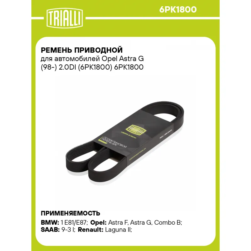 Ремень приводной для автомобилей Opel Astra G (98-) 2.0DI (6PK1800) Характеристики: Артикул: 6PK1800 OEM номера: 11287800485, 6788619, 6788620, 88WF6C301G1A, 88WF6C301G2A, 88GB450P710, 11720-JG30A, 11720-JG30B, 1340616, 1340627, 1340646, 6340633, 1340626, 1340664, 24452029, 55354682, 6340623, 8200093814, 4961058, 4575486, 5340526, 90510254, 91126385, 91151716, 93181711, 4414599, 53007595, 53010284, 53010285, 53031118, 90502735, 90510253, 90541338, 9118617, 93181710, 24413293 Количество на автомобиль: 1 Длина, мм.: 1800 Количество ребер: 6 Материал: EPDM Товарная линейка: BLACK Подходит для авто: BMW 1 E81/E87 (04-), 1 E81/E87 (04-) Opel Astra F (91-), Astra G (98-), Combo B (93-), Corsa B (91-), Omega B (94-), Vectra A (88-), Vectra B (95-), Zafira A (99-), Vectra B (95-) SAAB 9-3 I (98-) Renault Laguna II (01-) Для проверки применяемости отправьте VIN автомобиля через вкладку "Есть вопросы о товаре?" Комплектация: Ремень поликлиновой - 1 шт Гарантия: от 1 года.