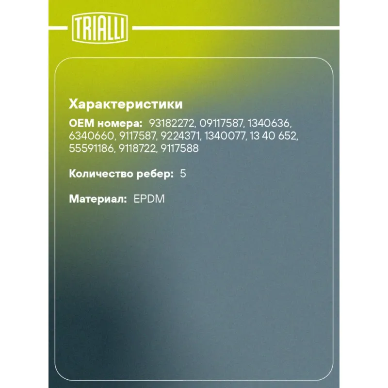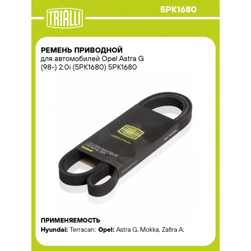 Ремень приводной для автомобилей Opel Astra G (98-) 2.0i (5PK1680) Характеристики: Артикул: 5PK1680 OEM номера: 93182272, 09117587, 1340636, 6340660, 9117587, 9224371, 1340077, 13 40 652, 55591186, 9118722, 9117588 Количество на автомобиль: 1 Длина, мм.: 1680 Количество ребер: 5 Материал: EPDM Товарная линейка: BLACK Номера аналоги: 5PK1678, 5PK1679, 5PK1680, 5PK1681, 5PK1682 Подходит для авто: Hyundai Terracan (01-) Opel Astra G (98-), Mokka (13-), Zafira A (99-), Astra H (04-), Zafira B (05-) Для проверки применяемости отправьте VIN автомобиля через вкладку "Есть вопросы о товаре?" Комплектация: Ремень поликлиновой - 1 шт Гарантия: от 1 года.