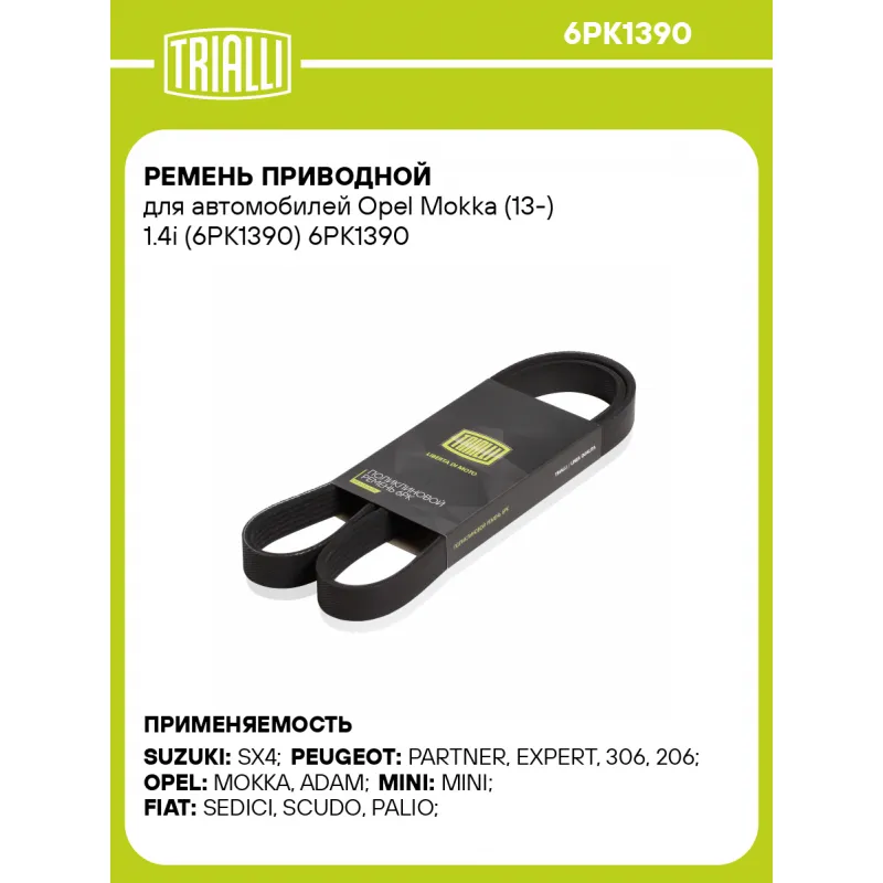 Ремень приводной для автомобилей Opel Mokka (13-) 1.4i (6PK1390) Характеристики: Артикул: 6PK1390 OEM номера: 11287520199, 4573974, 04573974AE, 4573974AE, 5750.GJ, 5750.S6, 5750.X6, 96267902, 96455832, 9645583280, 51758124, 9463378080, 9638463980, 46520499, 6000625282, 71743889, 71746714, 71753880, 94633780, 96267903, 9626790380, 9664471589, 500377890, 503644454, 5750.GP, 5750S5, 5750.Y6, 5750.EN, 5750.X2, 5750.Y0, 5750.Y1, 95141-79JA0, 124196014, 126709007, 127177007, 129729388, 129730388 Количество на автомобиль: 1 Длина, мм.: 1390 Количество ребер: 6 Материал: EPDM Товарная линейка: BLACK Комплектация: Ремень поликлиновой - 1 шт Гарантия: от 1 года.