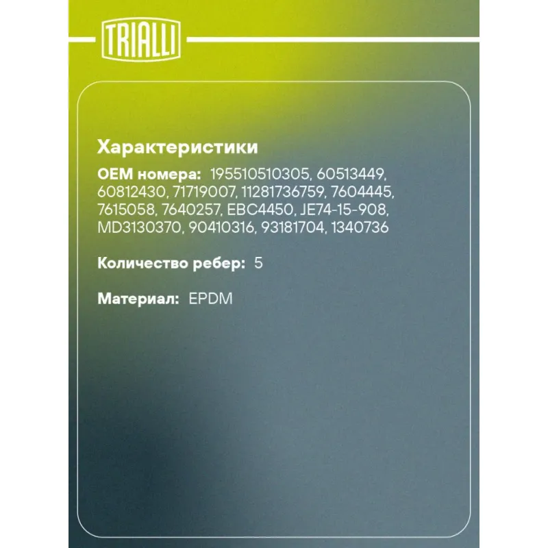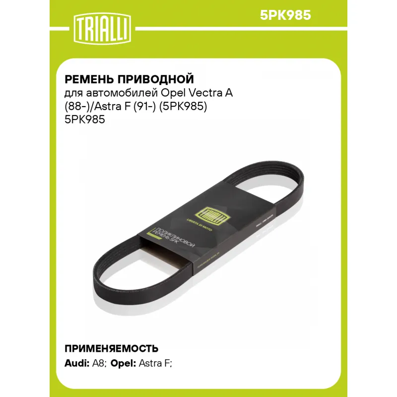 Ремень приводной для автомобилей Opel Vectra A (88-)/Astra F (91-) (5PK985) Характеристики: Артикул: 5PK985 OEM номера: 195510510305, 60513449, 60812430, 71719007, 11281736759, 7604445, 7615058, 7640257, EBC4450, JE74-15-908, MD3130370, 90410316, 93181704, 1340736, 90916-02173, 079903137AJ Количество на автомобиль: 1 Длина, мм.: 985 Количество ребер: 5 Материал: EPDM Товарная линейка: BLACK Номера аналоги: 5PK983, 5PK984, 5PK985, 5PK986, 5PK987 Подходит для авто: Audi A8 (10-) Opel Astra F (91-) Для проверки применяемости отправьте VIN автомобиля через вкладку "Есть вопросы о товаре?" Комплектация: Ремень поликлиновой - 1 шт Гарантия: от 1 года.