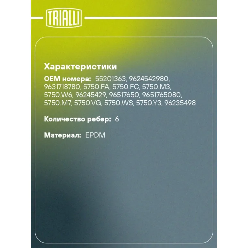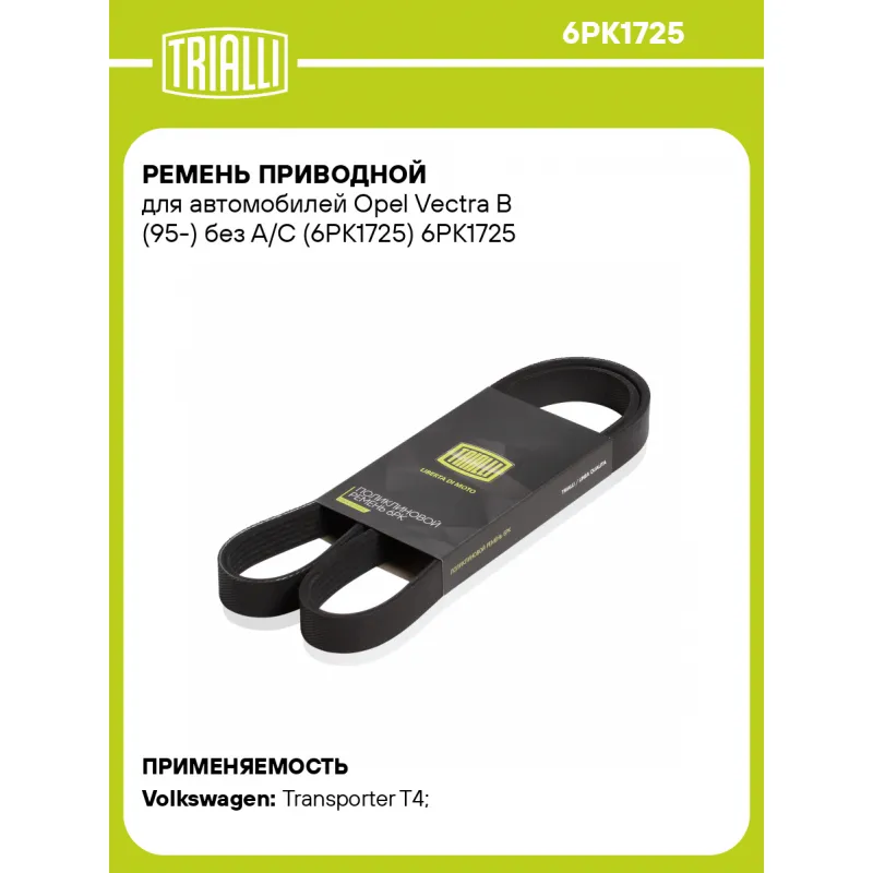 Ремень приводной для автомобилей Opel Vectra B (95-) без A/C (6PK1725) Характеристики: Артикул: 6PK1725 OEM номера: 55201363, 9624542980, 9631718780, 5750.FA, 5750.FC, 5750.M3, 5750.W6, 96245429, 96517650, 9651765080, 5750.M7, 5750.VG, 5750.WS, 5750.Y3, 96235498, 9623549880, K04627095AA, 8905002270, 1340613, 1340620, 1340648, 1340743, 90467131, 90501386, 9129467, 9225654, 6340636, 1340621, 91150005, 5750Y7, 96317187, 96420439, 5750M6, 55564662, 49180-65G11, 25183024, 96350327, 046903137M, 79340, L79340, 9118619, 9129102, 90500227, 93181716, 91126387, 90410700 Количество на автомобиль: 1 Длина, мм.: 1725 Количество ребер: 6 Материал: EPDM Товарная линейка: BLACK Подходит для авто: Volkswagen Transporter T4 (90-) Для проверки применяемости отправьте VIN автомобиля через вкладку "Есть вопросы о товаре?" Комплектация: Ремень поликлиновой - 1 шт Гарантия: от 1 года.