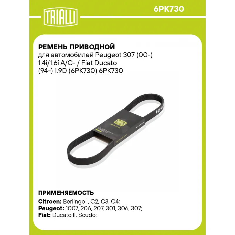 Ремень приводной для автомобилей Peugeot 307 (00-) 1.4i/1.6i A/C- / Fiat Ducato (94-) 1.9D (6PK730) Характеристики: Артикул: 6PK730 OEM номера: 96144504, 9640320380, 5750.E5, 5750GC, 5750H9, 5750WN, 575000000, 5750LC, 9620903880, 96209038, 11720D1101JP, 11720D4201, 11720D4291JP, 11720D4291KE, 96144507, 1612163080, 5750C3, 5750PV, 5750TP, 96424586, 96209042, 9642458680, E 117 690, 9936680730 Количество на автомобиль: 1 Длина, мм.: 730 Количество ребер: 6 Материал: EPDM Товарная линейка: BLACK Подходит для авто: Citroen Berlingo I (96-), C2 (03-), C3 (02-), C4 (04-), C-Elysee (12-), Jumpy (95-), Xsara I (97-), Jumper (94-) Peugeot 1007 (05-), 206 (98-), 206 (00-), 207 (06-), 301 (12-), 306 (97-), 307 (00-), 405 (88-), Expert (96-), Partner (96-), Boxer (94-) Fiat Ducato II (94-), Scudo (96-) Для проверки применяемости отправьте VIN автомобиля через вкладку "Есть вопросы о товаре?" Комплектация: Ремень поликлиновой - 1 шт Гарантия: от 1 года.
