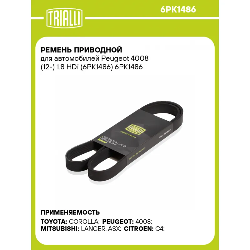 Ремень приводной для автомобилей Peugeot 4008 (12-) 1.8 HDi (6PK1486) Характеристики: Артикул: 6PK1486 OEM номера: 1607666680, 16076666, 88GB459P585, 4451A089, 96391367, 90080 91183, 127177010, 129730485 Количество на автомобиль: 1 Длина, мм.: 1486 Количество ребер: 6 Материал: EPDM Товарная линейка: BLACK Комплектация: Ремень поликлиновой - 1 шт Гарантия: от 1 года.