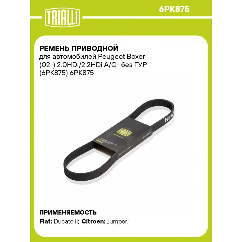 Ремень приводной для автомобилей Peugeot Boxer (02-) 2.0HDi/2.2HDi A/C- без ГУР (6PK875) Характеристики: Артикул: 6PK875 OEM номера: 11287534703, 5750QR, 5750.RK, 9652250580, 9652250480, H20206, 4403472, 4404042, 9111472, 9112042, 5750FN, 5750QQ, 036145933AL, 99919234750, 8200059425, 7700315600, 7700743548, 7701064334, 90916-02602, 278923126302, 06M903137AD Количество на автомобиль: 1 Длина, мм.: 875 Количество ребер: 6 Материал: EPDM Товарная линейка: BLACK Подходит для авто: Fiat Ducato II (94-) Citroen Jumper (94-) Для проверки применяемости отправьте VIN автомобиля через вкладку "Есть вопросы о товаре?" Комплектация: Ремень поликлиновой - 1 шт Гарантия: от 1 года.