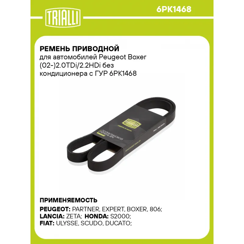 Ремень приводной для автомобилей Peugeot Boxer (02-)2.0TDi/2.2HDi без кондиционера с ГУР Характеристики: Артикул: 6PK1468 OEM номера: 11287830945, 9637250580, 5750EM, 5750X8, 5750XT, 5750.LA, 96334782, 9633478280, 96372505, 5750WH, 9633478180, 9638234780, 9647463180, 96334781, 9637931080, 9652746580, 38920-PCX-004, 38920-PCX-024, 5750KZ, 5750T5, 5750.X9, 35450-86CA0, 12643218 Количество на автомобиль: 1 Длина, мм.: 1468 Количество ребер: 6 Материал: EPDM Товарная линейка: BLACK Комплектация: Ремень поликлиновой - 1 шт Гарантия: от 1 года.