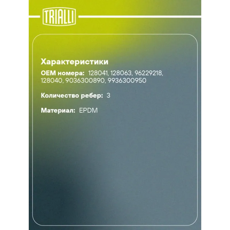 Ремень приводной для автомобилей Peugeot Boxer (94-)/Citroen Jumper (94-) 2.5d помпы (3PK945) Характеристики: Артикул: 3PK945 OEM номера: 128041, 128063, 96229218, 128040, 9036300890, 9936300950 Количество на автомобиль: 1 Длина, мм.: 945 Количество ребер: 3 Материал: EPDM Товарная линейка: BLACK Номера аналоги: 3PK943, 3PK944, 3PK945, 3PK946, 3PK947 Подходит для авто: Citroen Jumper (94-) Peugeot Boxer (94-) Fiat Ducato II (94-) Для проверки применяемости отправьте VIN автомобиля через вкладку "Есть вопросы о товаре?" Комплектация: Ремень поликлиновой - 1 шт Гарантия: от 1 года.