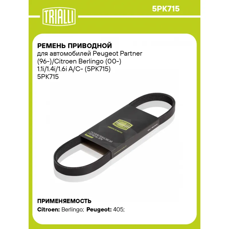 Ремень приводной для автомобилей Peugeot Partner (96-)/Citroen Berlingo (00-) 1.1i/1.4i/1.6i A/C- (5PK715) Характеристики: Артикул: 5PK715 OEM номера: 5750TW, 5750.D3, 5750.H4, 5750P6, 90538288, 91538177, 96273679, 5750P5, 5750WV, 575077, 5750.D2, 279023116314 Количество на автомобиль: 1 Длина, мм.: 715 Количество ребер: 5 Материал: EPDM Товарная линейка: BLACK Номера аналоги: 5PK713, 5PK714, 5PK715, 5PK716, 5PK717 Подходит для авто: Citroen Berlingo (00-) Peugeot 405 (88-) Для проверки применяемости отправьте VIN автомобиля через вкладку "Есть вопросы о товаре?" Комплектация: Ремень поликлиновой - 1 шт Гарантия: от 1 года.