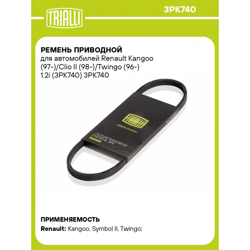 Ремень приводной для автомобилей Renault Kangoo (97-)/Clio II (98-)/Twingo (96-) 1.2i (3PK740) Характеристики: Артикул: 3PK740 OEM номера: 31110PE0003, 31110PE0004, 31110-PE0-0040, 11720-00Q2K, 11720-00Q3D, 11720-00QAR, 11720-00QAV, 5750FL, 8200065601, 8200830182, 90916-02314, 99363-80740, PQS101450, DBP9213, DBP9214, GFB350, GFB366, GMB30738 Количество на автомобиль: 1 Длина, мм.: 740 Количество ребер: 3 Материал: EPDM Товарная линейка: BLACK Номера аналоги: 3PK738, 3PK739, 3PK740, 3PK741, 3PK742 Подходит для авто: Renault Kangoo (97-), Symbol II (08-), Twingo (96-), Clio II (98-) Для проверки применяемости отправьте VIN автомобиля через вкладку "Есть вопросы о товаре?" Комплектация: Ремень поликлиновой - 1 шт Гарантия: от 1 года.