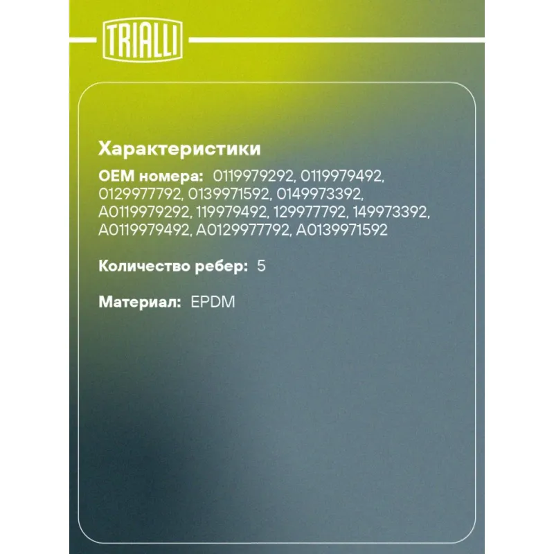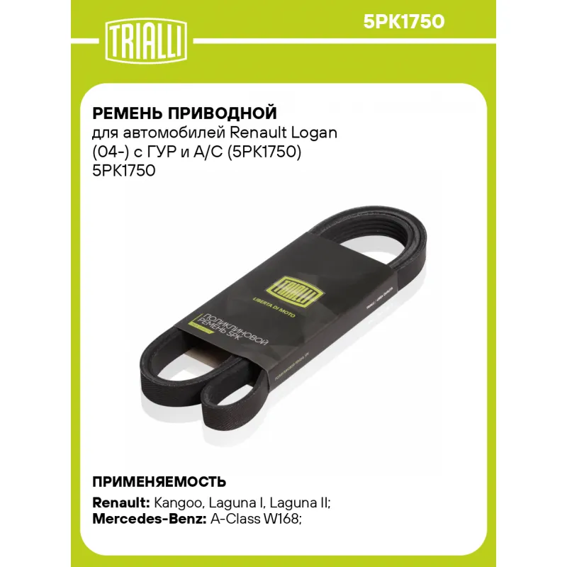 Ремень приводной для автомобилей Renault Logan (04-) с ГУР и A/C (5PK1750) Характеристики: Артикул: 5PK1750 OEM номера: 0119979292, 0119979492, 0129977792, 0139971592, 0149973392, A0119979292, 119979492, 129977792, 149973392, A0119979492, A0129977792, A0139971592, A0149973392, 139971592, 119979292, 11920-00QAA, 7700111671, 8200833541, 252122A320, 12652186 Количество на автомобиль: 1 Длина, мм.: 1750 Количество ребер: 5 Материал: EPDM Товарная линейка: BLACK Номера аналоги: 5PK1748, 5PK1749, 5PK1750, 5PK1751, 5PK1752 Подходит для авто: Renault Kangoo (97-), Laguna I (94-), Laguna II (01-), Logan (04-), Sandero I (09-), Clio II (98-), Logan (04-), Logan (08-), Megane I (95-), Megane I (95-), Scenic I (96-), Megane Scenic I (96-), Megane Scenic I (96-) Mercedes-Benz A-Class W168 (97-) Для проверки применяемости отправьте VIN автомобиля через вкладку "Есть вопросы о товаре?" Комплектация: Ремень поликлиновой - 1 шт Гарантия: от 1 года.