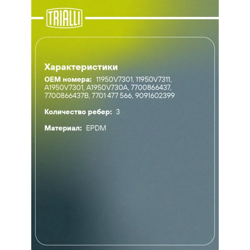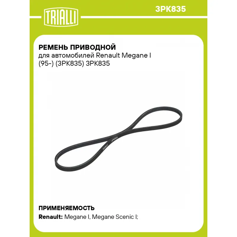 Ремень приводной для автомобилей Renault Megane I (95-) (3PK835) Характеристики: Артикул: 3PK835 OEM номера: 11950V7301, 11950V7311, A1950V7301, A1950V730A, 7700866437, 7700866437B, 7701 477 566, 9091602399 Количество на автомобиль: 1 Длина, мм.: 835 Количество ребер: 3 Материал: EPDM Товарная линейка: BLACK Номера аналоги: 3PK833, 3PK834, 3PK835, 3PK836, 3PK837 Подходит для авто: Renault Megane I (95-), Megane Scenic I (96-) Для проверки применяемости отправьте VIN автомобиля через вкладку "Есть вопросы о товаре?" Комплектация: Ремень поликлиновой - 1 шт Гарантия: от 1 года.