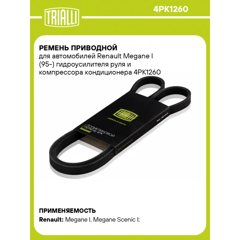 Ремень приводной для автомобилей Renault Megane I (95-) гидроусилителя руля и компрессора кондиционера Характеристики: Артикул: 4PK1260 OEM номера: 7700273010, 7701069257, 7700862173, 77 01 477 564, 77 01 477 563, 77 01 477 565, 9091602146, ERR2678 Количество на автомобиль: 1 Длина, мм.: 1260 Количество ребер: 4 Материал: EPDM Товарная линейка: BLACK Номера аналоги: 4PK1258, 4PK1259, 4PK1260, 4PK1261, 4PK1262 Подходит для авто: Renault Megane I (95-), Megane I (95-), Megane Scenic I (96-), Megane Scenic I (96-) Для проверки применяемости отправьте VIN автомобиля через вкладку "Есть вопросы о товаре?" Комплектация: Ремень поликлиновой - 1 шт Гарантия: от 1 года.