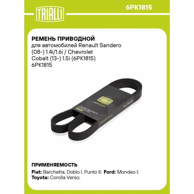 Ремень приводной для автомобилей Renault Sandero (08-) 1.4i/1.6i / Chevrolet Cobalt (13-) 1.5i (6PK1815) Характеристики: Артикул: 6PK1815 OEM номера: 71734717, 71719645, 90048-31065, 60667257, 55189680, 46801957, 46803271, 1011688, 1650770, 6168158, 6833788, 4001215, 4024820, XS2E-8620NA, 88WF6C301F2A, F53E8620AB, F53E8620AP, F83E8620AA, XS2E8620MA, XS2E8620MB, 4188206, 6182615, 7204035, 88WF-6C301B1A, 88WF-6C301B1B, 88WF-6C301B2A, 88GB450P712, 88GB450P716, 88GB459P712, 88GB459P716, 8200356268, 8200821800, 9091602551, 99366H1810, 90916 02482, 99366 31820, 90916 02506, F77Z8620BA, XS2Z8620NA, 12626076, 25183130, E4G16-1025051BA Количество на автомобиль: 1 Длина, мм.: 1815 Количество ребер: 6 Материал: EPDM Товарная линейка: BLACK Подходит для авто: Fiat Barchetta (95-), Doblo I (01-), Punto II (99-), Strada (99-) Ford Mondeo I (93-) Toyota Corolla Verso (01-) Для проверки применяемости отправьте VIN автомобиля через вкладку "Есть вопросы о товаре?" Комплектация: Ремень поликлиновой - 1 шт Гарантия: от 1 года.