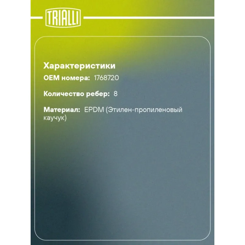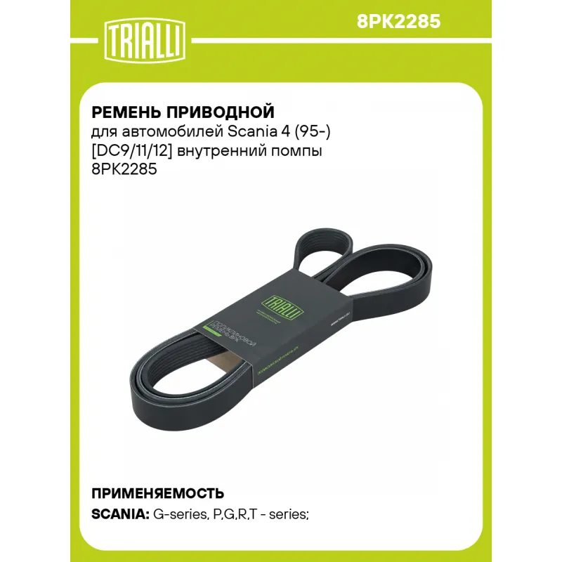 Ремень приводной для автомобилей Scania 4 (95-) [DC9/11/12] внутренний помпы Характеристики: Артикул: 8PK2285 OEM номера: 1768720 Материал: EPDM (Этилен-пропиленовый каучук) Количество ребер: 8 Длина, мм.: 2285 Товарная линейка: BLACK Количество на автомобиль: 1 Комплектация: Ремень поликлиновой - 1 шт Гарантия: от 1 года.