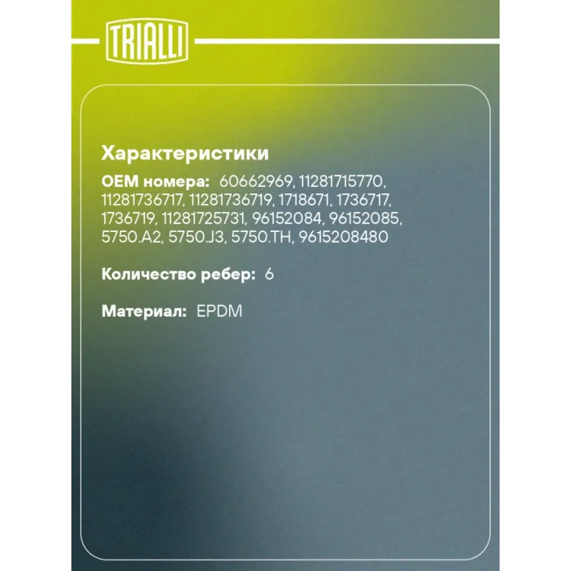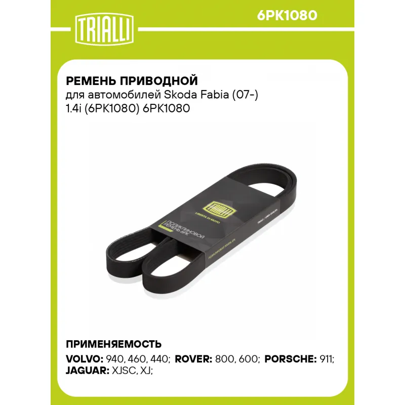 Ремень приводной для автомобилей Skoda Fabia (07-) 1.4i (6PK1080) Характеристики: Артикул: 6PK1080 OEM номера: 60662969, 11281715770, 11281736717, 11281736719, 1718671, 1736717, 1736719, 11281725731, 96152084, 96152085, 5750.A2, 5750.J3, 5750.TH, 9615208480, 38920-P5L-003, 38920-P5L-004, 38920-PCA-003, 38920-PCA-004, 60815412, 1119970092, A1119970092, E 117 710, 5010248035, 038145933J, 809221150, A21R32.1045020, 25212-2S000, 030145933K, 032145933J, 036145933J, 06B145933, 036145933AK, 036145933AT, SPA145933A, 036145933AJ, 03L903137D Количество на автомобиль: 1 Длина, мм.: 1080 Количество ребер: 6 Материал: EPDM Товарная линейка: BLACK Комплектация: Ремень поликлиновой - 1 шт Гарантия: от 1 года.