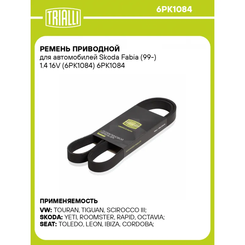Ремень приводной для автомобилей Skoda Fabia (99-) 1.4 16V (6PK1084) Характеристики: Артикул: 6PK1084 OEM номера: 11287835483, 036145933F, 6Q0903137A, 5M5Q6C301BA, 46806144, 71728659, 71749444, 38920-P1E-003, 38920-P1E-004, 38920-P1E-J01, 38920-P1E-J02, 5862029000, 5862029010, 8943801580, 06Q903137A, 3064404, 3805922 Количество на автомобиль: 1 Длина, мм.: 1084 Количество ребер: 6 Материал: EPDM Товарная линейка: BLACK Комплектация: Ремень поликлиновой - 1 шт Гарантия: от 1 года.