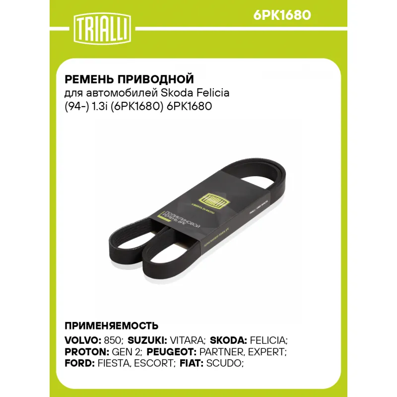 Ремень приводной для автомобилей Skoda Felicia (94-) 1.3i (6PK1680) Характеристики: Артикул: 6PK1680 OEM номера: 9655029580, 9655029780, 5750 PY, 5750 HE, 9464867280, 1084993, 1320286, 7143870, 94AB6C301AA, 97AB6C301AA, 88GB459P659, 1611682780, 5750KR, 5750-QE, 7700870961, 9514186CA0, 9514186CB0, 9091602660, 90916-02733, 1275726, 047145933E, 47145933, 78903137, 5435174, 3680197, 3682261, L110599 Количество на автомобиль: 1 Длина, мм.: 1680 Количество ребер: 6 Материал: EPDM Товарная линейка: BLACK Комплектация: Ремень поликлиновой - 1 шт Гарантия: от 1 года.