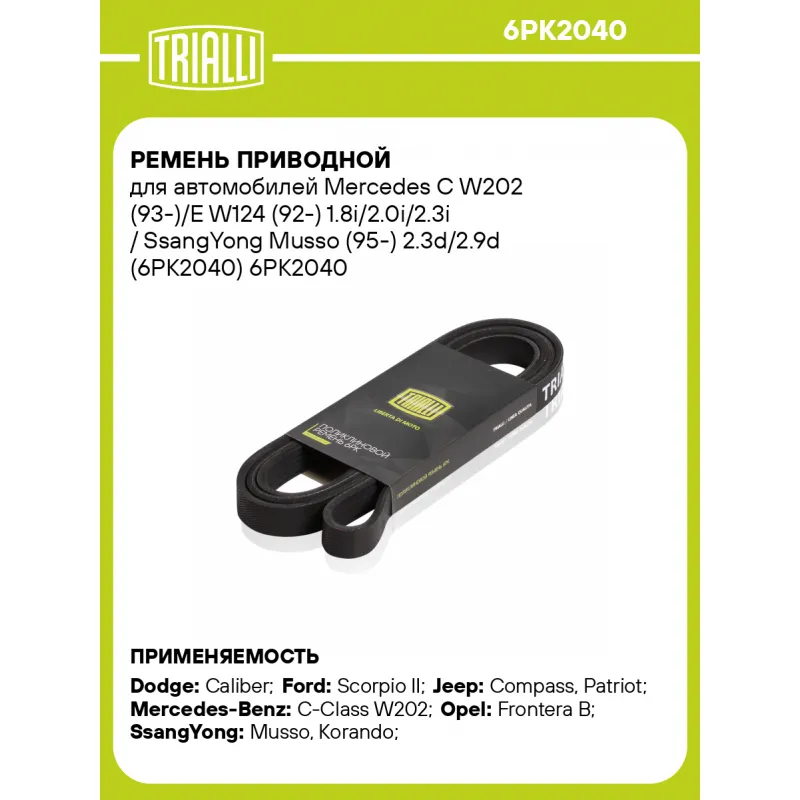 Ремень приводной для автомобилей Mercedes C W202 (93-)/E W124 (92-) 1.8i/2.0i/2.3i / SsangYong Musso (95-) 2.3d/2.9d (6PK2040) Характеристики: Артикул: 6PK2040 OEM номера: 4891692AB, 1033499, 96WF6C301AB, 1027405, 96WF6C301AA, 1854734, 5867257350, 97130561, 8-97130-561-0, 0109970592, 0109977192, 0119974292, 0119975492, A0109970592, A0109977192, A0119974292, A0119975492, 109970592, 109977192, 119974292, 119975492, 10067477, 04891692AB, K04891692AB Количество на автомобиль: 1 Длина, мм.: 2040 Количество ребер: 6 Материал: EPDM Товарная линейка: BLACK Подходит для авто: Dodge Caliber (07-) Ford Scorpio II (94-) Jeep Compass (07-), Patriot (07-) Mercedes-Benz C-Class W202 (93-) Opel Frontera B (98-) SsangYong Musso (93-), Korando (95-) Для проверки применяемости отправьте VIN автомобиля через вкладку "Есть вопросы о товаре?" Комплектация: Ремень поликлиновой - 1 шт Гарантия: от 1 года.