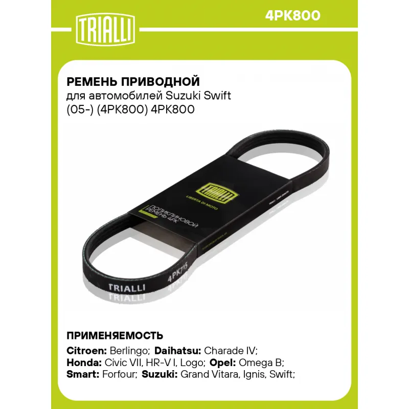 Ремень приводной для автомобилей Suzuki Swift (05-) (4PK800) Характеристики: Артикул: 4PK800 OEM номера: 11287570266, 11287631825, 88458-87712, 88458-87713, 9936400800, 71742126, 71747596, 71768552, 31110-P2A-003, 31110-P2A-004, 31110P3RT01, 31110P2J003, 38920-PEC-003, 38920-PEC-004, 5860090350, 8943821071, 14451A023, 4451A023, 1172053Y00, 117202F000, 117202F005, 1172053Y01, 1172053Y10, 1172053Y20, 90543954, 1854736, 1854715, 94382107, 1752185C11, 1752161A00, 17521-61A10, 1752161A60, 90916-02299, 9514160A50, 95141-61M00, 95141-61M10, 17521M61A00, 17521M61A10, 90916-02298, 90916-02350, 9091602352, 99364-80800, 9091602670, 9118367, MB376-15-907, A0019934496, 19934496, 19930796, A0019930796 Количество на автомобиль: 1 Длина, мм.: 800 Количество ребер: 4 Материал: EPDM Товарная линейка: BLACK Номера аналоги: 4PK798, 4PK799, 4PK800, 4PK801, 4PK802 Подходит для авто: Citroen Berlingo (00-) Daihatsu Charade IV (93-) Honda Civic VII (00-), HR-V I (98-), Logo (96-) Opel Omega B (94-) Smart Forfour (04-) Suzuki Grand Vitara (98-), Ignis (03-), Swift (05-) Kia Pride (87-) Для проверки применяемости отправьте VIN автомобиля через вкладку "Есть вопросы о товаре?" Комплектация: Ремень поликлиновой - 1 шт Гарантия: от 1 года.