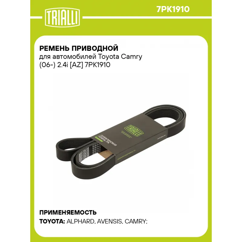 Ремень приводной для автомобилей Toyota Camry (06-) 2.4i [AZ] Характеристики: Артикул: 7PK1910 OEM номера: 9091602563, 9091602652, 90916A2011 Материал: EPDM Количество ребер: 7 Длина, мм.: 1910 Гарантийный срок: 2 года/60 000 км. Товарная линейка: BLACK Количество на автомобиль: 1 Комплектация: Ремень поликлиновой - 1 шт Гарантия: от 1 года.