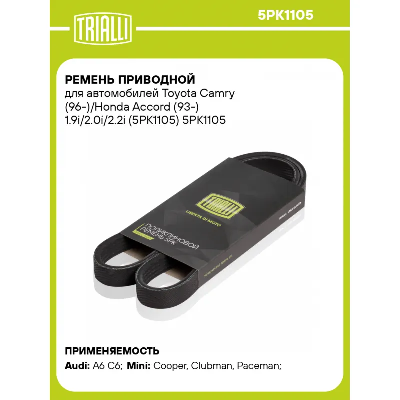 Ремень приводной для автомобилей Toyota Camry (96-)/Honda Accord (93-) 1.9i/2.0i/2.2i (5PK1105) Характеристики: Артикул: 5PK1105 OEM номера: 60513478, 195511000000, 71739622, 7718418, 71749437, 6453CV, 6453FK, 6453TZ, 500344281, 71739927, 71753866, 99462544, 31110PR7A01, 31110PR7A12, 38920PT0003, 38920PT00032, 38920PT0004, 504019980, 5003344281, 6453NY, 6453CT, 6453FJ, 7700107493, 7700107494, 90916-02116, 9091602197, 9091602256, 9091602257, 9091602382, 9091602383, 9936581100, 90916-20116, 9936501100, 9936521100, 9936531100, 9936551100, 9936571100, 079903137E, 11288511920, 8511920, 11288573418, 38920-PTO-0032, GFB404, GFB406, GFB407, PQS100760EVA, PWS100730EVA Количество на автомобиль: 1 Длина, мм.: 1105 Количество ребер: 5 Материал: EPDM Товарная линейка: BLACK Номера аналоги: 5PK1103, 5PK1104, 5PK1105, 5PK1106, 5PK1107 Подходит для авто: Audi A6 C6 (04-) Mini Cooper (06-), Clubman (07-), Paceman (12-) Для проверки применяемости отправьте VIN автомобиля через вкладку "Есть вопросы о товаре?" Комплектация: Ремень поликлиновой - 1 шт Гарантия: от 1 года.