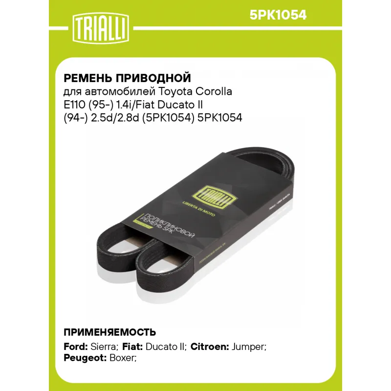 Ремень приводной для автомобилей Toyota Corolla E110 (95-) 1.4i/Fiat Ducato II (94-) 2.5d/2.8d (5PK1054) Характеристики: Артикул: 5PK1054 OEM номера: 71749430, 60807358, 96261720, 5750Q1, 5750Q2, 5750XE, 7646849, 71712149, 6592377, 1011700, 1026597, 6592376, 92SF6C301A2A, 92SX6C301A1B, 38920PK10030, 38920PK1013, 38920PK1014, 38920PK1024, 38920PK1003, 38920PK1004, 38920PK1023, 7702169, F80715909A, 99365210508P, 90080-91171, 9009982018, 9091602201, 9936501050, 9936521050, 9936551050, 99365-61050, 99365-71050, 99365-81050, 90916-02362, BYDF3-8103013 Количество на автомобиль: 1 Длина, мм.: 1054 Количество ребер: 5 Материал: EPDM Товарная линейка: BLACK Номера аналоги: 5PK1052, 5PK1053, 5PK1054, 5PK1055, 5PK1056 Подходит для авто: Ford Sierra (82-) Fiat Ducato II (94-) Citroen Jumper (94-) Peugeot Boxer (94-) Для проверки применяемости отправьте VIN автомобиля через вкладку "Есть вопросы о товаре?" Комплектация: Ремень поликлиновой - 1 шт Гарантия: от 1 года.