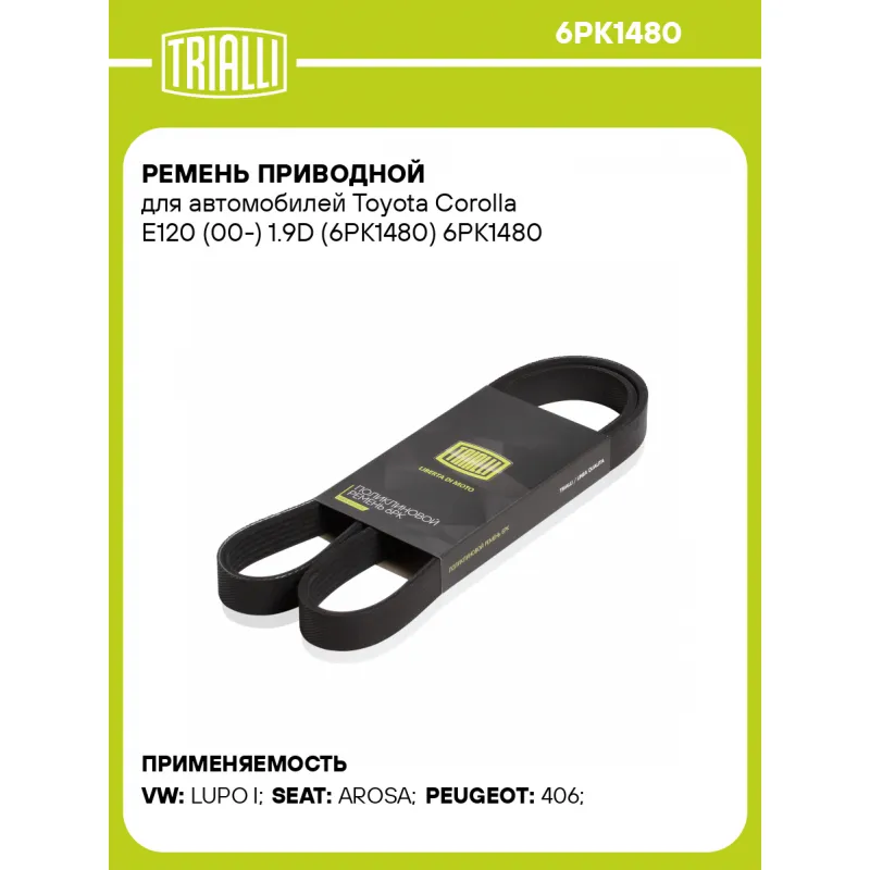 Ремень приводной для автомобилей Toyota Corolla E120 (00-) 1.9D (6PK1480) Характеристики: Артикул: 6PK1480 OEM номера: 51.96820-0380, 5750Q3, 9008091196, 047903137F Количество на автомобиль: 1 Длина, мм.: 1480 Количество ребер: 6 Материал: EPDM Товарная линейка: BLACK Комплектация: Ремень поликлиновой - 1 шт Гарантия: от 1 года.