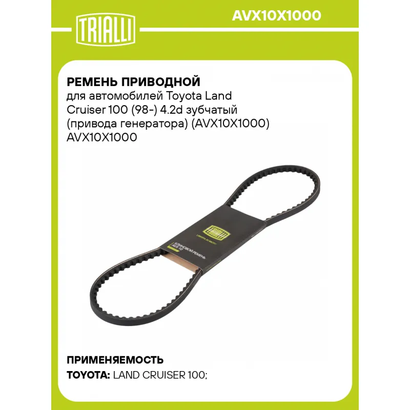 Ремень приводной для автомобилей Toyota Land Cruiser 100 (98-) 4.2d зубчатый (привода генератора) (AVX10X1000) Характеристики: Артикул: AVX10X1000 OEM номера: 4803951, 9832114, 98432114, A0059976692, A0099970392, A0069970792, A0099975392, A0059976792, 0099975392, 0059976792, 99970392, 0099970392, 59976792, 0069970792, 99975392, 59976692, 69970792, 0059976692, 9091602452, 90916-02248, 90916-02330 Длина: 1000 Длина, мм.: 1000 Гарантийный срок: 2 года/60 000 км. Количество на автомобиль: 1 Материал: EPDM Товарная линейка: BLACK Комплектация: Ремень клиновой зубчатый - 1 шт Гарантия: от 1 года.