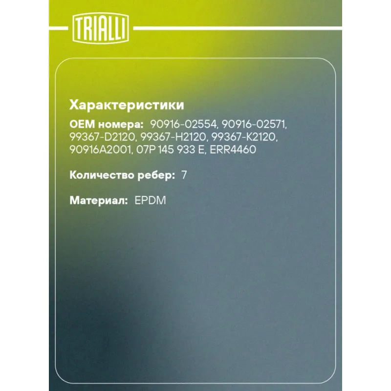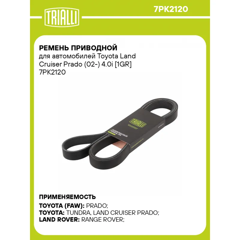 Ремень приводной для автомобилей Toyota Land Cruiser Prado (02-) 4.0i [1GR] Характеристики: Артикул: 7PK2120 OEM номера: 90916-02554, 90916-02571, 99367-D2120, 99367-H2120, 99367-K2120, 90916A2001, 07P 145 933 E, ERR4460 Материал: EPDM Количество ребер: 7 Длина, мм.: 2120 Гарантийный срок: 2 года/60 000 км. Количество на автомобиль: 1 Товарная линейка: BLACK Комплектация: Ремень поликлиновой - 1 шт Гарантия: от 1 года.
