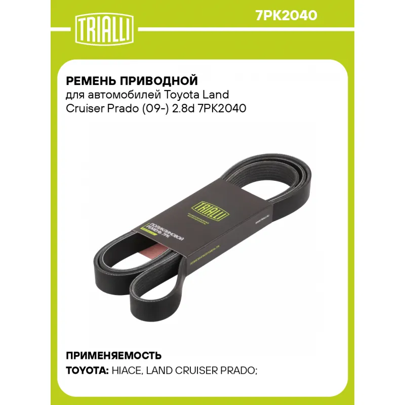Ремень приводной для автомобилей Toyota Land Cruiser Prado (09-) 2.8d Характеристики: Артикул: 7PK2040 OEM номера: 99367-K2040 Материал: EPDM Количество ребер: 7 Длина, мм.: 2040 Гарантийный срок: 2 года/60 000 км. Количество на автомобиль: 1 Товарная линейка: BLACK Комплектация: Ремень поликлиновой - 1 шт Гарантия: от 1 года.